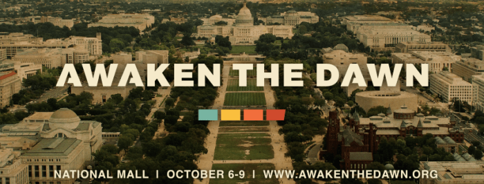 This October, we have an opportunity to be involved in an incredible worship event called Awaken the Dawn.  The event will be held in Washington D.C., the first weekend in October.  This is a massive ‘tent city’ worship gathering on the National Mall, all around and near the Washington monument, Capital Hill, the Jefferson and Lincoln memorials, and the White House!!  There will be 50 tents set up, one for each US state, as well as 5 large tents for the regions of our nation, plus one for Israel.  In each tent, day and night worship, for 2 straight days, will be held.  This will involve hundreds of musicians and singers, all giving praise to the Lord in our nations capitol, day and night!  Wow!!  The culmination will be a day of worship & prayer named Arise: The Deborah Call, calling women to stand together for Jesus & for our nation.
