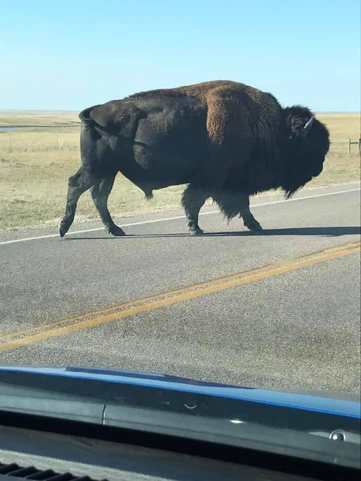The Lord often speaks to me through His creation, and fortunately, we had a chance to take a side trip on our way back to Rapid City, South Dakota, through the Badlands National Park. We saw buffalo, prairie dogs, and pronghorn sheep, in this very unique area. At one point, we stopped on the side of the road, to watch a group of buffalo. All of a sudden, this big guy ambled across the road, shocking us by stopping right in the middle, right in front of us! He stood there, just sort of ‘surveying his kingdom’, looking this way and that, not at all in a hurry. It was as if he was letting us know, “Hey, I live here, this is my land, and I’m definitely in charge, people! I’ll move when I am ready.” No problem big fella, cause LOOK at you!!! (and he was not at all intimidated by our little compact rental car) Finally, he decided to leisurely continue on his way.