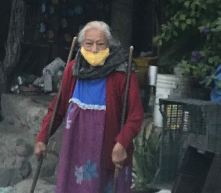 Wayne maintains a safe distance, due to pandemic, thus sitting and visiting with her longer, is not possible right now. As best we can tell, she lives at the top of a narrow and steep, very old, concrete staircase. Many collected items, perhaps of significant importance to her, are stacked along the way, and into the entrance of her home. To watch how carefully she comes down the last couple of steps, it is hard to imagine how she climbs up them. In ongoing effort to maintain safe distance, we don’t wish to burden her with a heavy load to carry up. This is often a struggle, when wondering how much more she might need. She seems healthy, and well groomed, and at times a neighbor will nod or smile as we drive off, so it would seem that she is watched over in her colonia. The red sweater in the photo and scarf around her neck, appeared in recent, cooler days, so she seems to be either provided for or able to look after herself. We also came to realize that the brooms, while equipping her in sweeping up the daily grime of a busy crowded street and dusty hillsides, also keep her steady on her feet, as she has difficulty walking. She always takes a brief rest on the stoop, when Wayne arrives, to see what delights may be in her specially packed food bag.