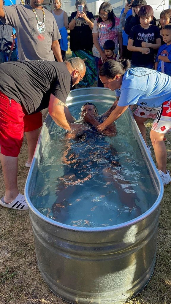Each day consisted of several hours of worship, primarily in the afternoons, while groups of intercessors and others went to different parts of Pine Ridge to pray and share the Gospel. They covered ALOT of territory in 3 days! We led worship and prayer on the Pow Wow grounds, under a large tent. We had truly, Holy Spirit-led times and had very targeted Scriptures released, and read over the land. When the intercessors returned, they came back with good reports! What an honor to be a part of all of this in the way the Lord has directed us! In the evenings, speakers and more worship, but our favorite thing was the BAPTISMS!! By the time Friday afternoon rolled around, 56 people received baptism!!! What a joy to see men, women and children, go under the water, dying with Jesus, and emerging from the water, a new creation. How exciting! Even better, there are several established local Native believers, who will be following up with those who were baptized. Baptisms in a water trough, in South Dakota, on beautiful Pine Ridge reservation, under a beautiful blue sky, with a huge crowd cheering…I gotta say, that’s a pretty cool thing to witness.